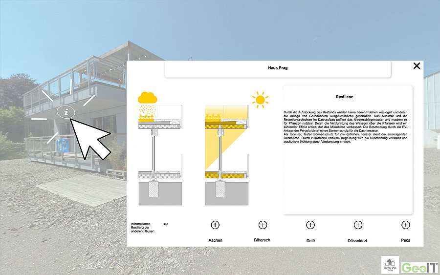 Ab sofort bietet die Internetseite des Living Lab NRW einen VR-Rundgang durch das Gelände, die Häuser und die Energiezentrale an. An vielen Stellen sind zusätzliche Informationen über die Architektur, die Baukonstruktion sowie die Gebäudetechnik abrufbar. Probieren Sie es hier aus!