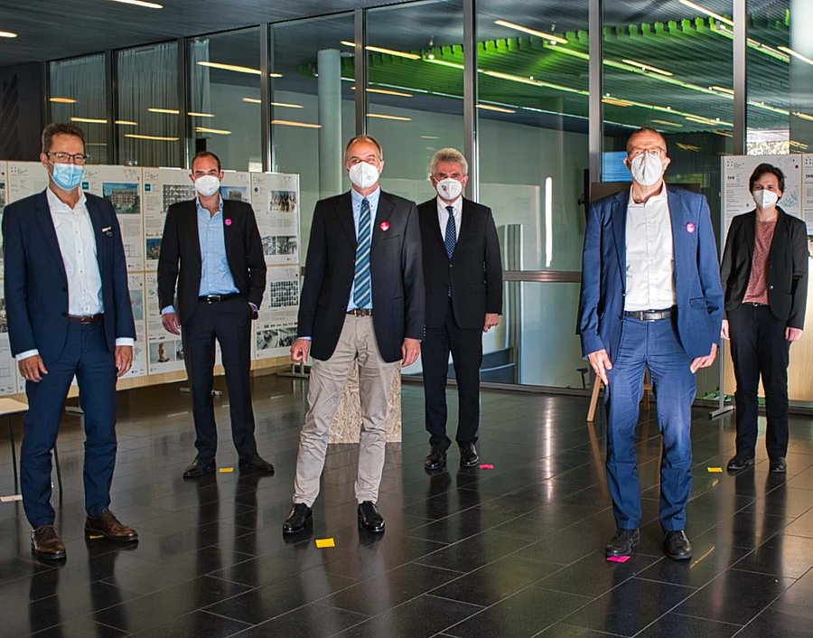 Mit dem Living Lab NRW entsteht in Wuppertal eine zentrale Forschungs- und Bildungseinrichtung für innovative Lösungen rund um das nachhaltige Leben und klimaneutrale Bauen in Städten. Prof. Dr. Andreas Pinkwart, Minister für Wirtschaft, Innovation, Digitalisierung und Energie des Landes NRW, enthüllte am 5. Mai im Beisein der Projektleitung, des Rektors der Bergischen Universität Wuppertal Prof. Dr. Lambert T. Koch und des Oberbürgermeisters Prof. Dr. Uwe Schneidewind die Tafel, die zukünftig die breite Öffentlichkeit über das Projekt informieren wird.