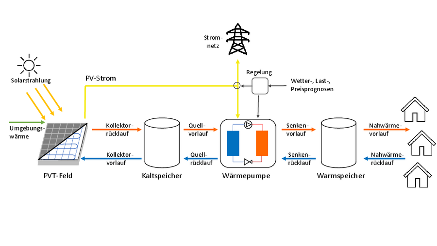 Mit der Energiezentrale auf dem Campus wird für einen Großteil der Gebäude ein Niedertemperaturwärmenetz realisiert. Die zentrale, modulierende Sole-Wasser Wärmepumpe nutzt dazu ein Feld mit Hybridkollektoren als Wärmequelle. Die sogenannten PVT-Kollektoren nutzen die Solarenergie sowohl für die Strom- als auch die Wärmeerzeugung und besitzen auf der Rückseite zusätzlich einen Außenluftwärmetauscher. Somit ist ein 24-Stunden Betrieb als Wärmequelle möglich. Durch den Einsatz von Pufferspeichern auf der kalten und warmen Seite der Wärmepumpe soll deren Betrieb so gesteuert werden, dass die Nutzung des eigenen Solarstroms maximiert wird. Netzstrom soll vorzugsweise zu den Niedertarifzeiten eines dynamischen Tarifsystems zum Einsatz kommen.